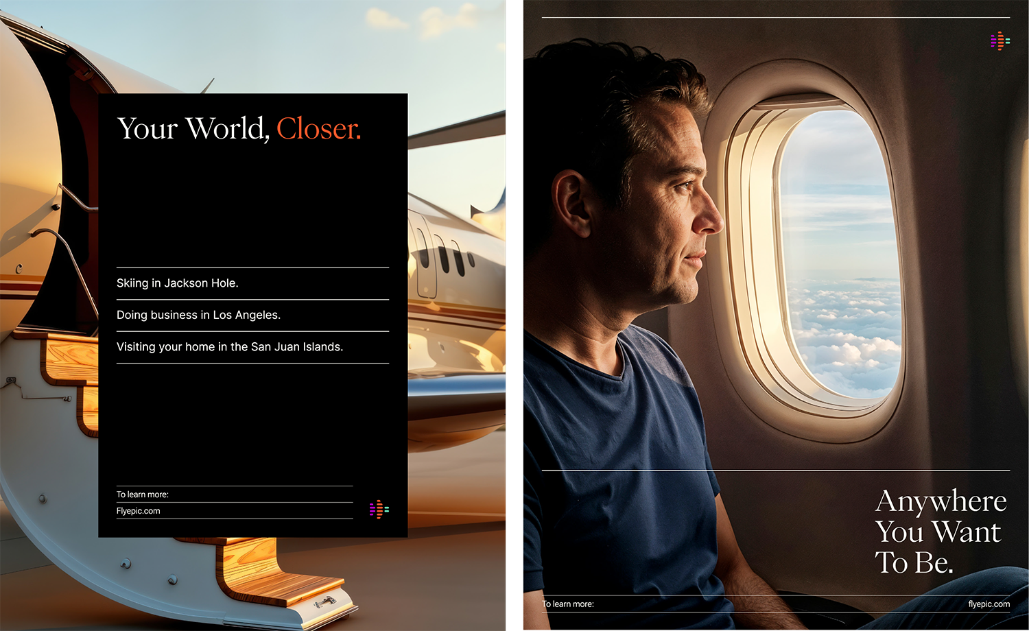 As Creative Director, Andrea brought a visionary, culture-driven approach to the development of FlyEpic’s brand identity. Her direction positioned FlyEpic not merely as a private aviation service, but as a lifestyle brand, one that reflects and amplifies the values of a new generation of luxury travelers. The solution was a bold, lifestyle-centric identity that redefined what it means to fly private in the modern era. Rather than leaning on outdated tropes of exclusivity or status, Andrea’s design system prioritized emotional resonance, focusing on selling experiences, aspirations, and cultural belonging instead of just flights. This shift allowed FlyEpic to connect more authentically with its audience, inviting them to see themselves as part of a larger, aspirational movement.